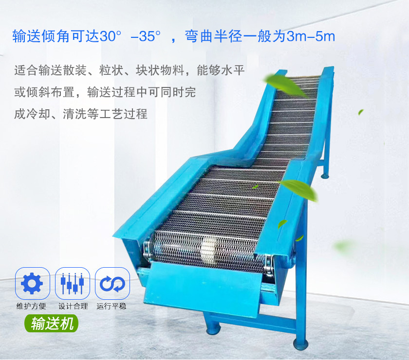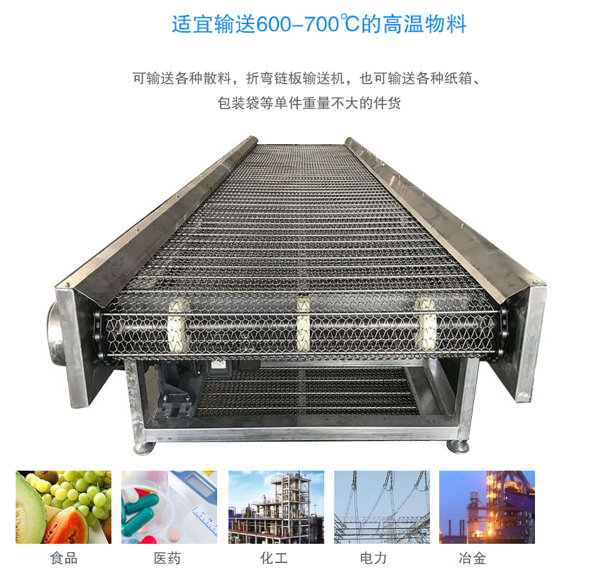 鏈板輸送機采用鏈板輸送帶180°鏈板輸送機用于銜接,與其他輸送設備配合使用能充分節省空間并能起到良好的輸送效果。轉彎角度可分:60°、90°、180°。可輸送的物料種類繁多,既可輸送各種散料,折彎鏈板輸送機,也可輸送各種紙箱、包裝袋等單件重量不大的件貨,廣泛應用于食品、醫藥、化工、電力、冶金等行業,適宜輸送600-700℃的高溫物料。