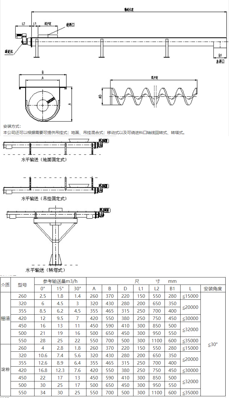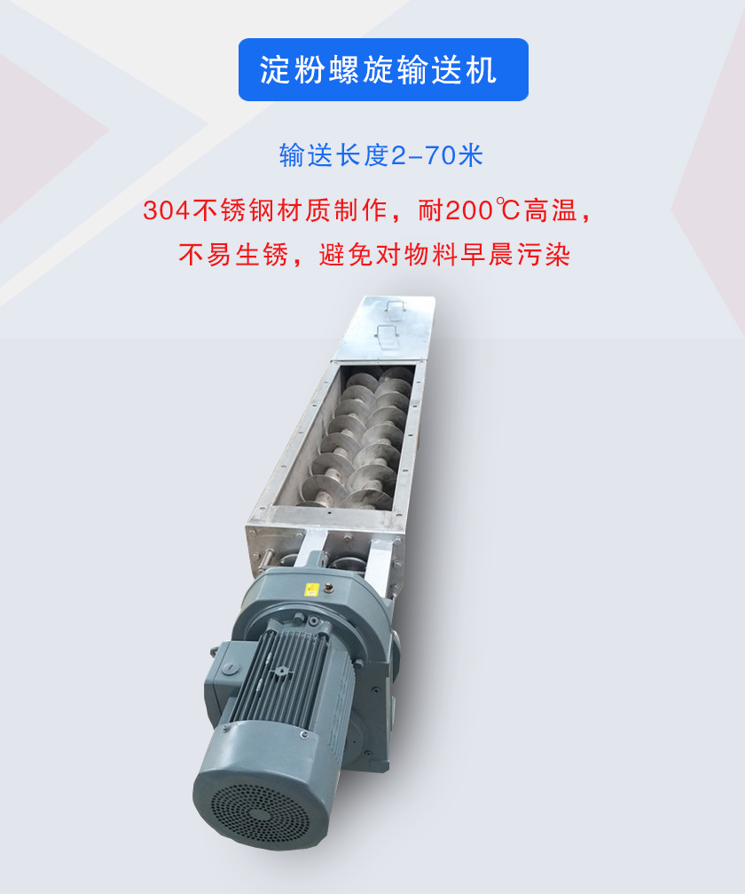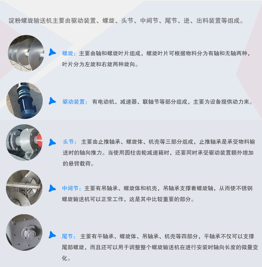 淀粉螺旋輸送機主要由驅(qū)動裝置、螺旋、頭節(jié)、中間節(jié)、尾節(jié)、進、出料裝置等組成。