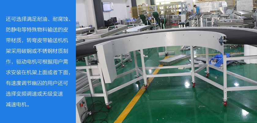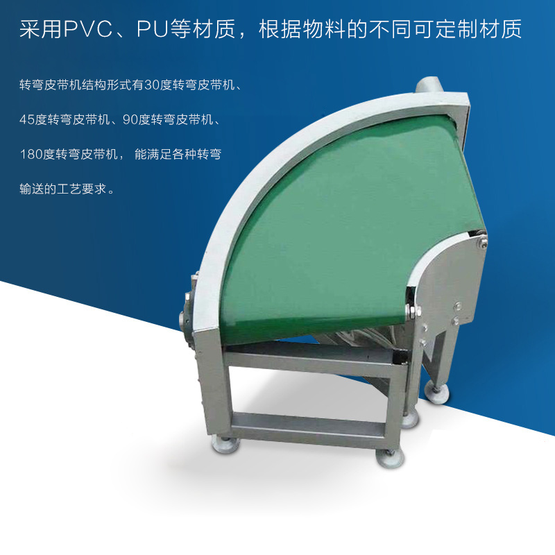 轉(zhuǎn)彎皮帶輸送機(jī)簡(jiǎn)稱轉(zhuǎn)彎皮帶機(jī)可30°,45°,90°和180°輸送物料,轉(zhuǎn)彎皮帶輸送機(jī)輸送帶可根據(jù)輸送物料的性質(zhì)選擇PVC、PU材質(zhì),除輸送普通物料外,還可選擇滿足耐油、耐腐蝕、防靜電等特殊物料輸送的皮帶材質(zhì).