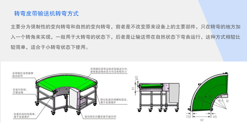 主要分為強(qiáng)制性的變向轉(zhuǎn)彎和自然的變向轉(zhuǎn)彎,前者是不改變?cè)瓉?lái)設(shè)備上的主要部件,只在轉(zhuǎn)彎的地方加入一個(gè)轉(zhuǎn)角來(lái)實(shí)現(xiàn),一般用于大轉(zhuǎn)彎的狀態(tài)下,后者是讓輸送帶在自然狀態(tài)下彎曲運(yùn)行,這種方式相較比較簡(jiǎn)單,適合于小轉(zhuǎn)彎狀態(tài)下使用。