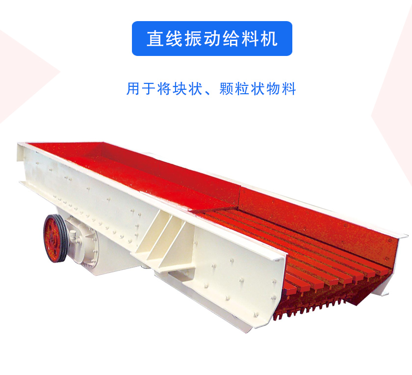 直線振動給料機又叫直線振動送料機,簡稱直線給料機,主要用于將塊狀、顆粒狀物料從貯料倉中均勻定時連續(xù)地給到受料裝置中去,在砂石破碎生產(chǎn)線中,直線振動給料機可以為破碎機連續(xù)均勻地喂料,并對物料進行粗篩分。