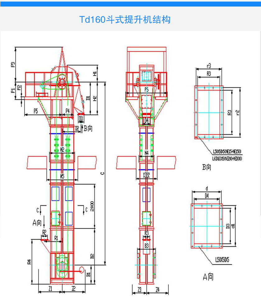td160型斗式提升機(jī)由運(yùn)行部分(料斗與牽引膠帶),帶有傳動(dòng)滾筒的上部區(qū)段,帶有拉緊滾筒的下部區(qū)段、中間機(jī)殼、驅(qū)動(dòng)裝置、逆止制動(dòng)裝置等組成,