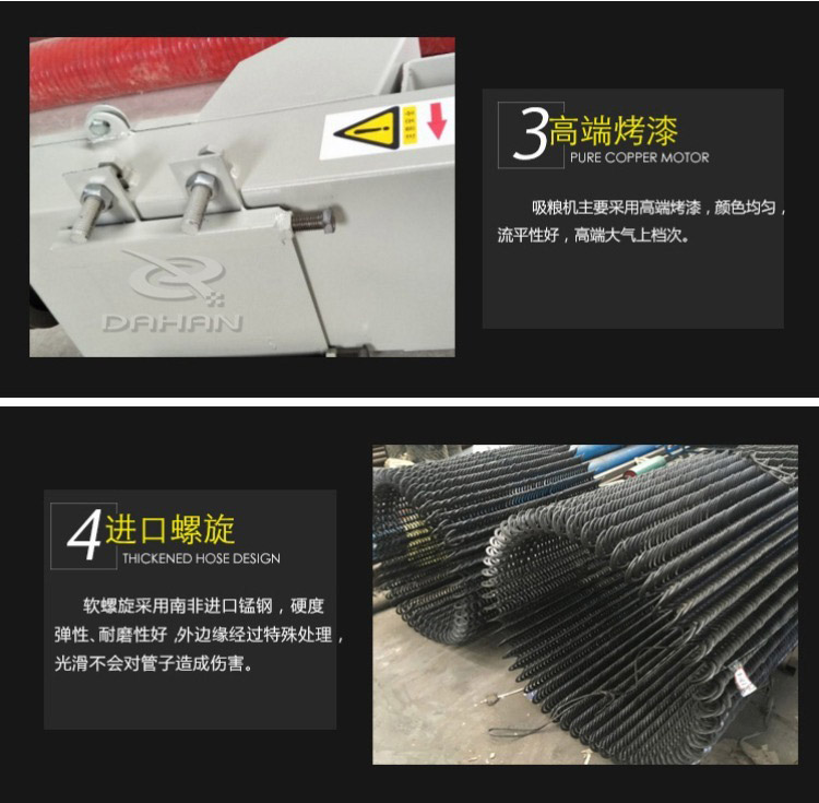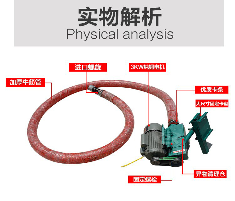 糧食的收購入車的操作,該絞龍具有省時(shí)、省力、省人工的功效。而且重量輕,有兩個(gè)人操作可以了,加進(jìn)了糧食收購過程,大大節(jié)省了時(shí)間,受到了廣大糧食收購者的歡迎!糧食用吸糧機(jī)機(jī):便捷式抽糧器,本機(jī)器具有體積小、功率大、攜帶方便等特點(diǎn),全國少見生產(chǎn)新型產(chǎn)品。機(jī)器使用電源220V(兩相電可操作),機(jī)身長度8米,每小時(shí)抽糧10-12噸,機(jī)器重量75公斤,適合下鄉(xiāng)抽糧使用,能使您減輕人工負(fù)擔(dān)。省工省時(shí)省力,下鄉(xiāng)抽糧神器。使用220V電壓和380V電壓兩種,簡單實(shí)用,設(shè)計(jì)合理,體積小,每小時(shí)提升6噸糧食,直接卡在貨車箱的加高壁上就可以了,可彎曲可移動(dòng),可分體,攜帶方便,是各種糧食作物裝車、卸車、出庫、入庫等的好設(shè)備,即省工又省力