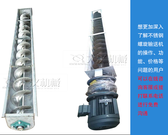 以上就是大漢小編為您介紹的輸送葡萄干所用的不銹鋼螺旋輸送機(jī),想更加深入了解不銹鋼螺旋輸送機(jī)的操作、功能、價(jià)格等問題的用戶可以在線咨詢客服或撥打聯(lián)系電話進(jìn)行免費(fèi)溝通。