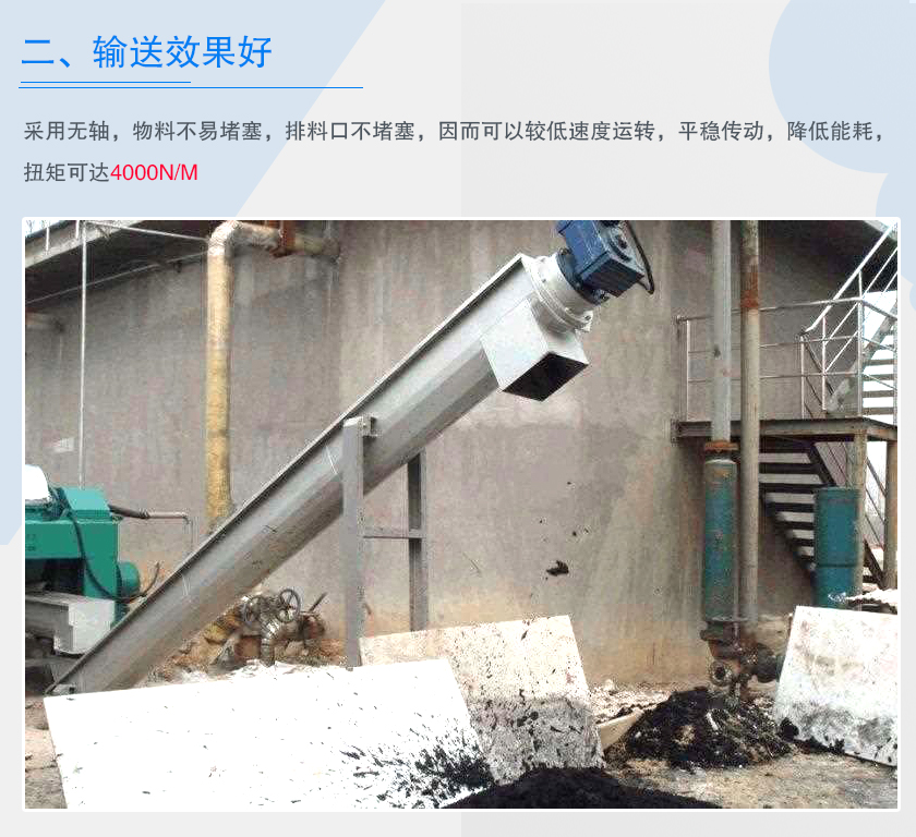 無軸螺旋輸送機(jī)由于采用無軸,物料不易堵塞,排料口不堵塞,因而可以較低速度運(yùn)轉(zhuǎn),平穩(wěn)傳動(dòng),降低能耗,扭矩可達(dá)4000N/m,輸送量是相同直徑傳統(tǒng)有軸螺旋輸送機(jī)的1.5倍,單機(jī)輸送長(zhǎng)度可達(dá)60米。并可根據(jù)用戶需要,采用多級(jí)串聯(lián)式安裝。