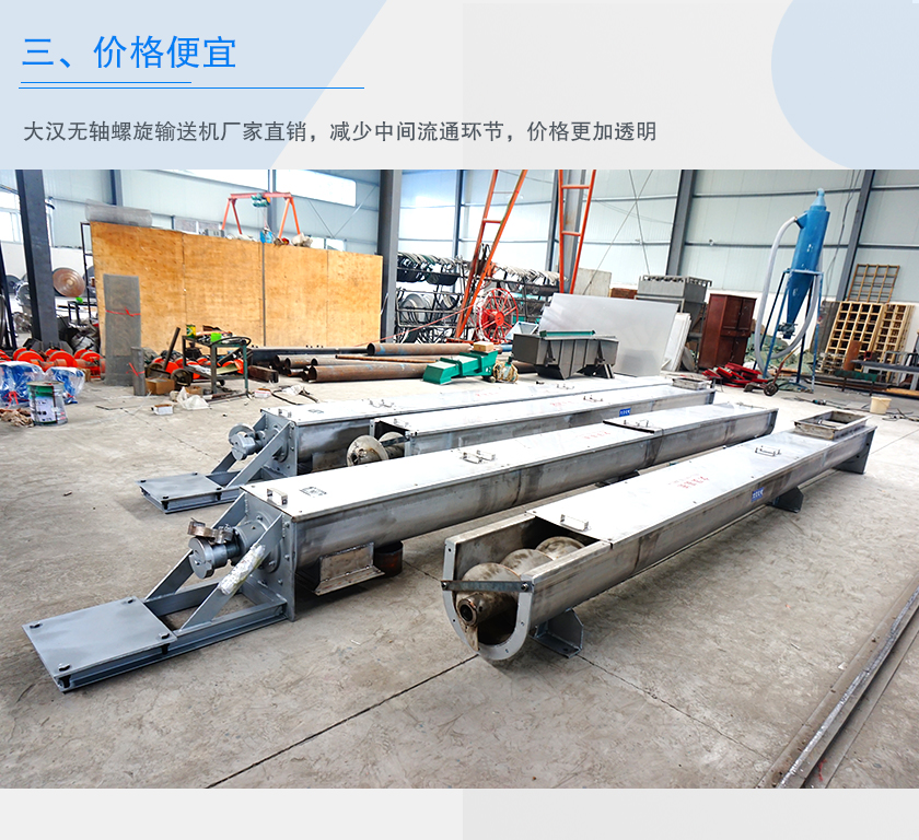 大漢無軸螺旋輸送機(jī)廠家直銷,減少中間流通環(huán)節(jié),價(jià)格更加透明,廠家位于河南省新鄉(xiāng)市,生產(chǎn)成本較北京、上海等地會(huì)更加便宜,所以無軸螺旋輸送機(jī)價(jià)格也會(huì)更低。
