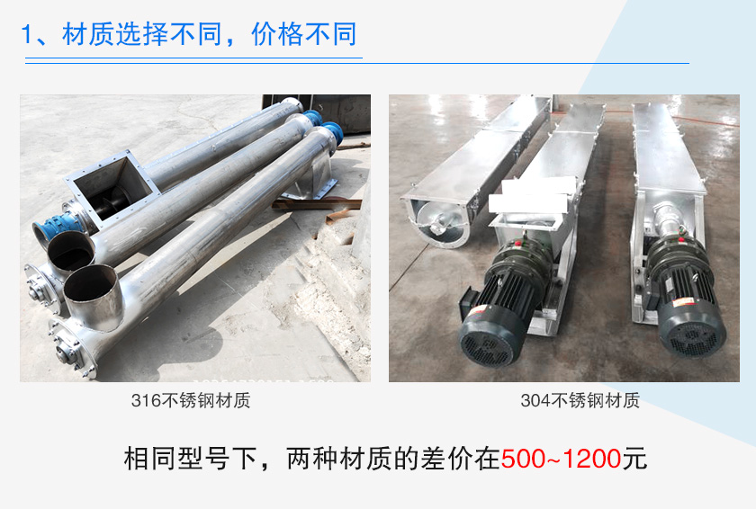 不銹鋼螺旋輸送機(jī)選擇的不銹鋼材質(zhì)一般包含304、316兩種,選擇不同材質(zhì),其價格會存在差異化,316不銹鋼材質(zhì)會比304不銹鋼材質(zhì)耐腐蝕,能抵抗更高的溫度,當(dāng)然在制造成本上也會更高,相同型號下,兩種材質(zhì)的差價在500~1200元。